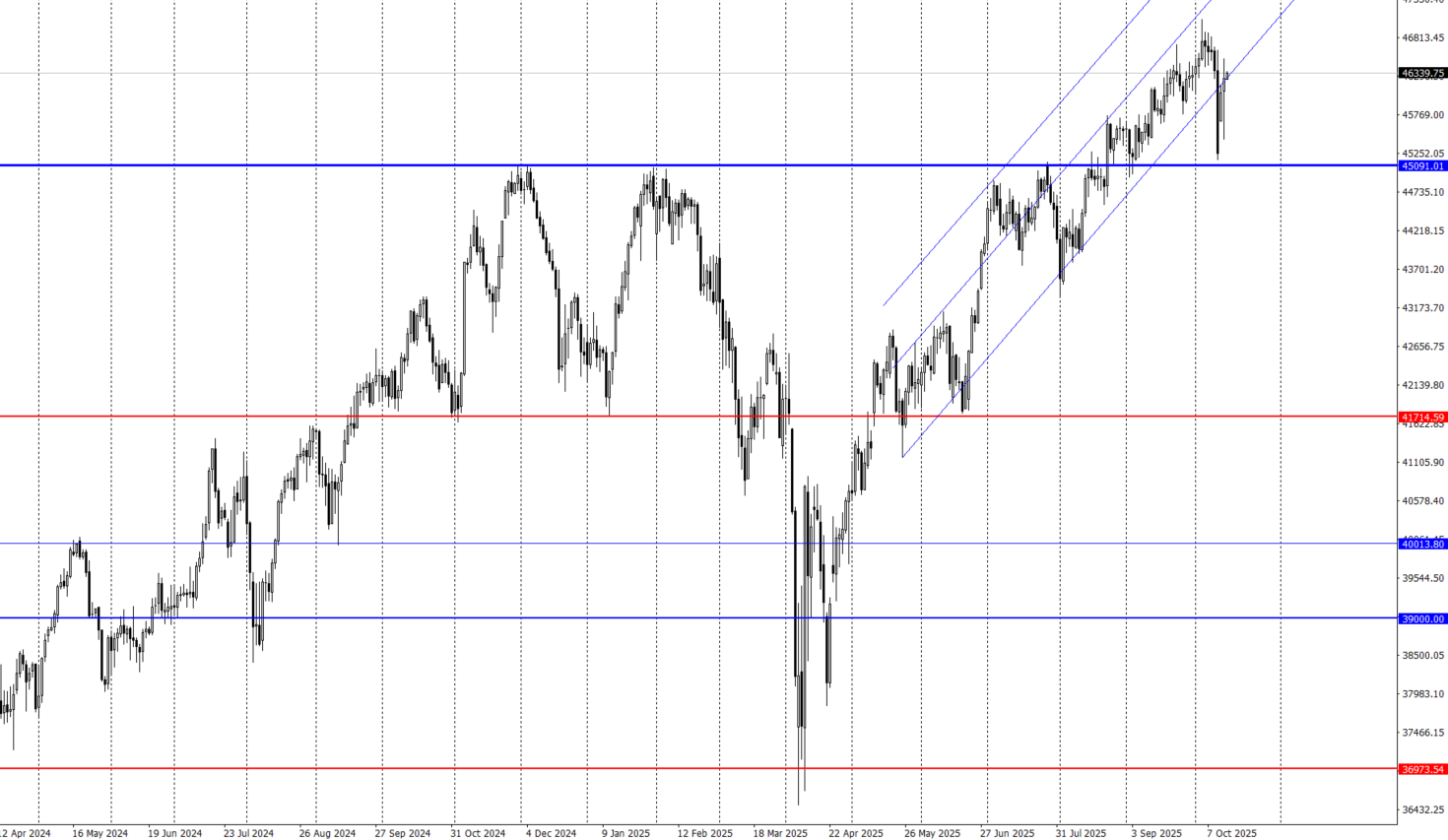 ダウとS&Pについては、チャネルラインを外れる動きを見せたものの