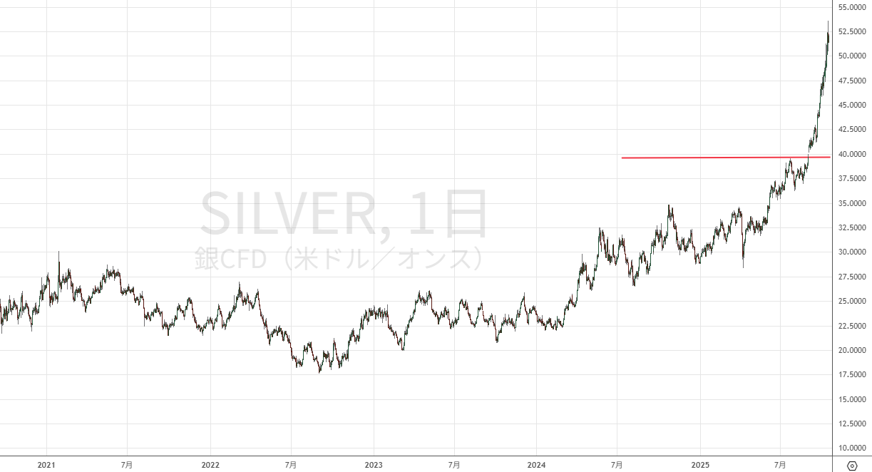 こちらも史上最高値を更新し1オンス50ドルの大台に突入しています。