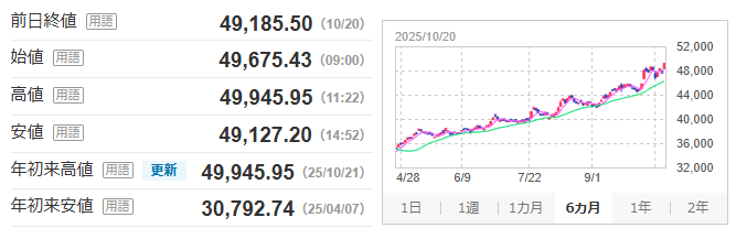 日経平均は本日11時22分に史上最高値となる49,945.95円を記録!