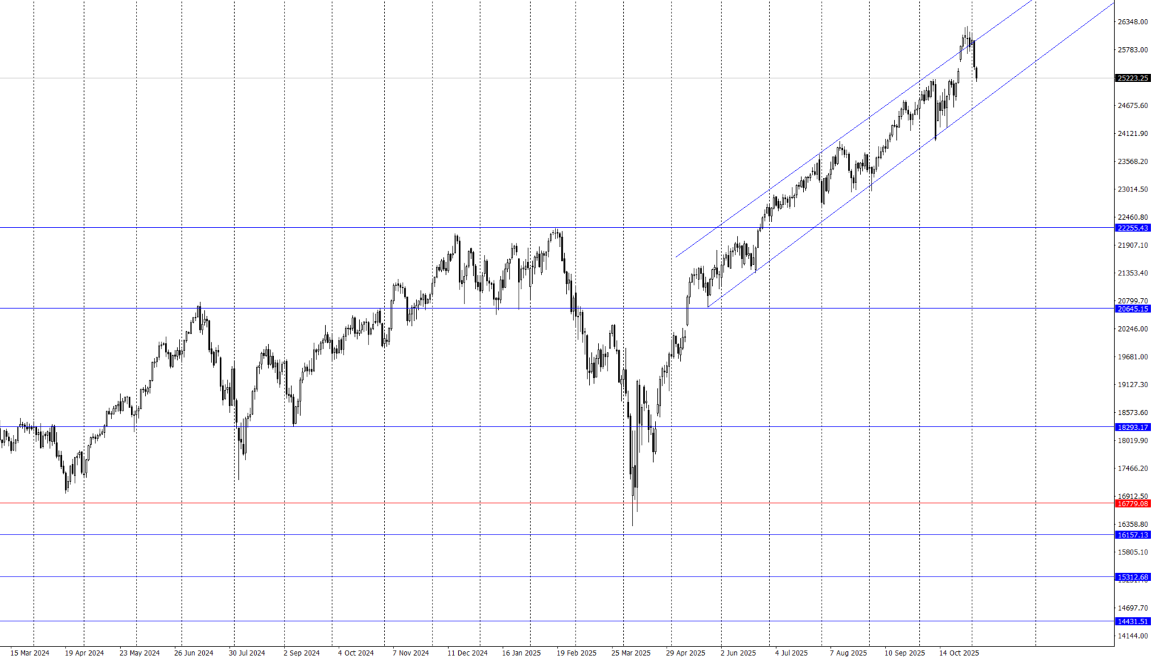 ナスダックのチャートでチャネルラインを下抜けしてくるようなことがあると